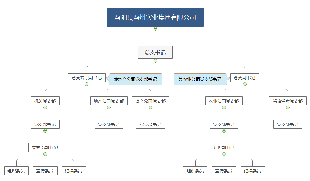 中共酉陽縣酉州實(shí)業(yè)集團(tuán)有限公司總支部委員會(huì): 冉勇為黨總支部書記、楊秀峰為總支部副書記,張光流為紀(jì)律委員、冉華偉為宣傳委員、張宗孝為組織委員。
